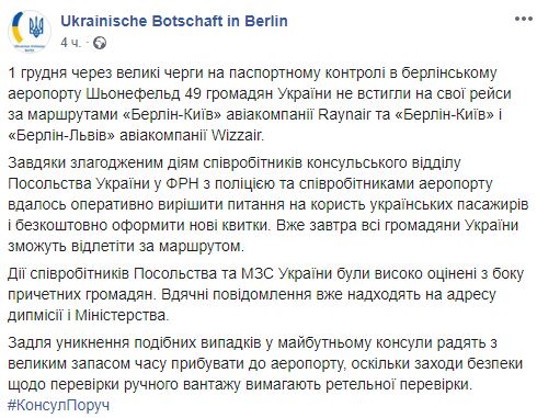 "Благодаря слаженным действиям сотрудников консульского отдела Посольства Украины в ФРГ, полиции и сотрудников аэропорта удалось оперативно решить вопрос в пользу украинских пассажиров и бесплатно оформить новые билеты. Уже завтра все граждане Украины смогут улететь по маршруту", - идет речь в сообщении.