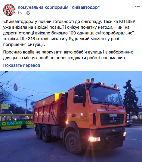 Кстати, "Киевавтодор" уже опубликовал в Facebook пост о том, что коммунальщики находятся "в полной готовности к снегопаду".