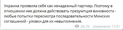 По его словам, вопрос не должен ставиться в плоскости выгодно-невыгодно что-то Украине. "Вопрос элементарного выполнения Киевом обязательств", - считает он.