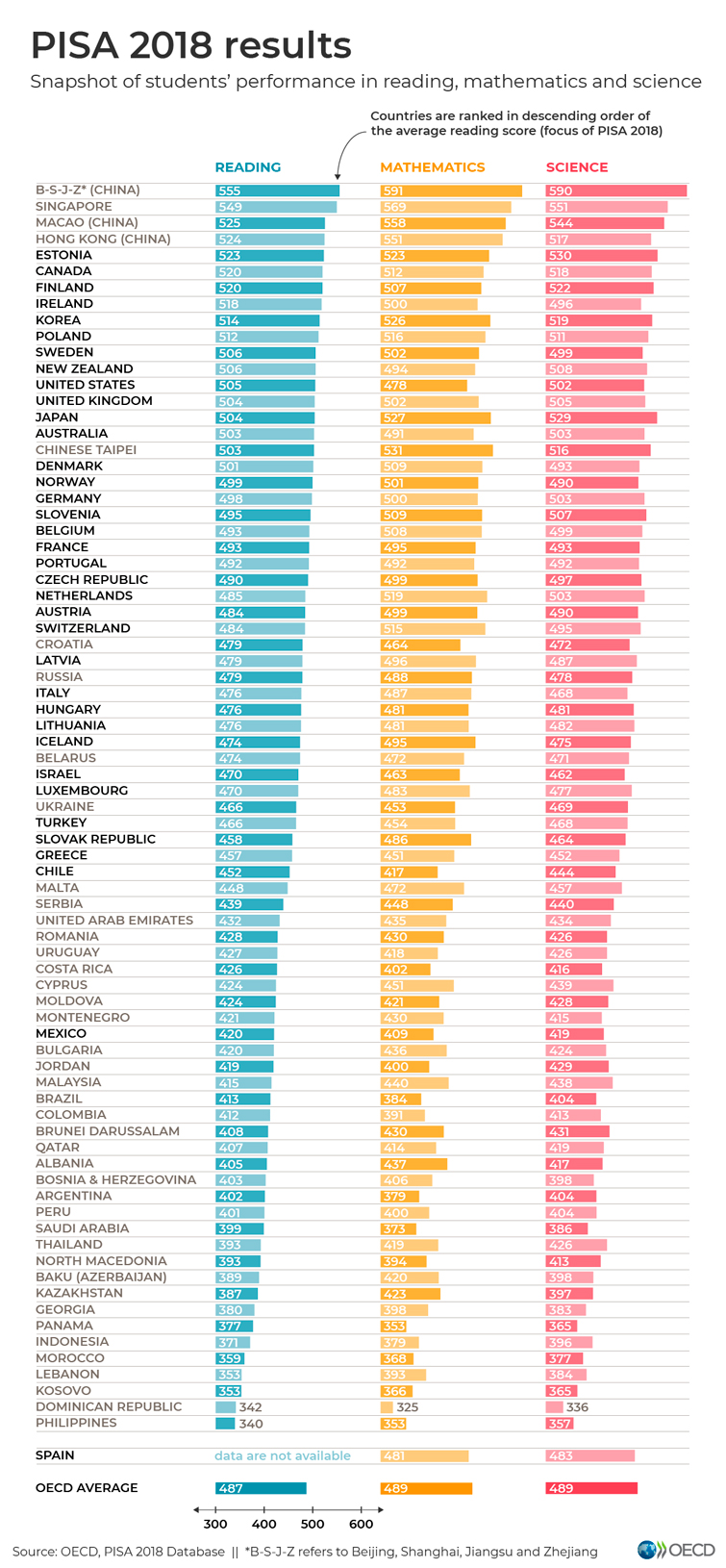 Лучшие результаты у китайских школьников - 555 баллов. Однако в КНР исследования проводили не по всей стране, а только в четырех провинциях. Хуже всего ситуация в филиппинских школьников, в среднем набрали 340 баллов.