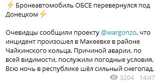 На снимке видно, что машина с логотипом мониторинговой миссии перевернутая лежит на обочине. Очевидцы сообщили, что инцидент произошел в районе Чайкинского кольца в Макеевке. Причиной аварии, очевидно, стали погодные условия. Всю ночь в населенном пункте шел сильный снегопад.