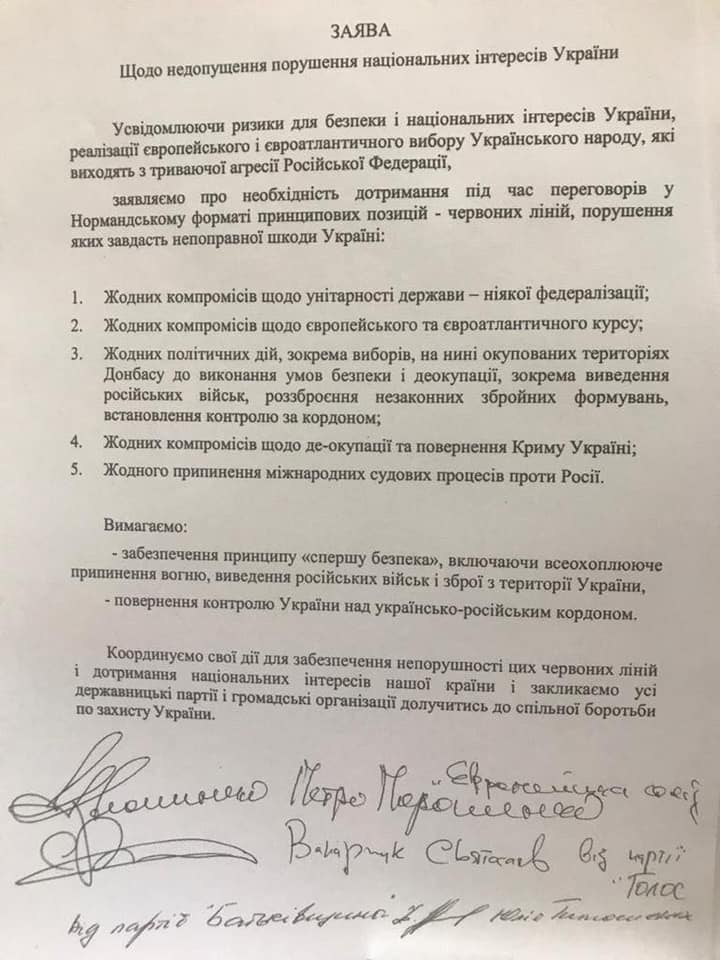 - Никаких политический действий, в частности выборов на временно оккупированных территориях Донбасса до выведения российских войск, разоружения незаконных вооруженных формирований, установления контроля над государственной границей