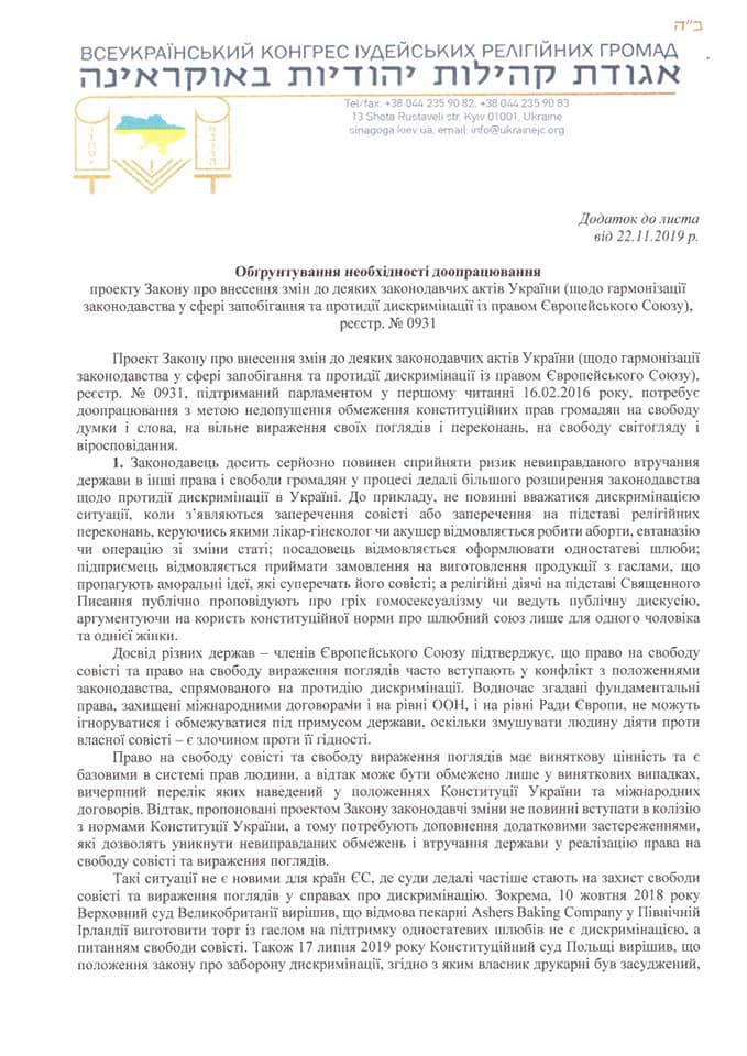 Раввин обратился к властям от имени еврейской религиозной общины Киева. По мнению членов общины, борьба с дискриминацией не должна нивелировать основополагающие права человека, например, право на свободу совести и на свободу выражения взглядов.