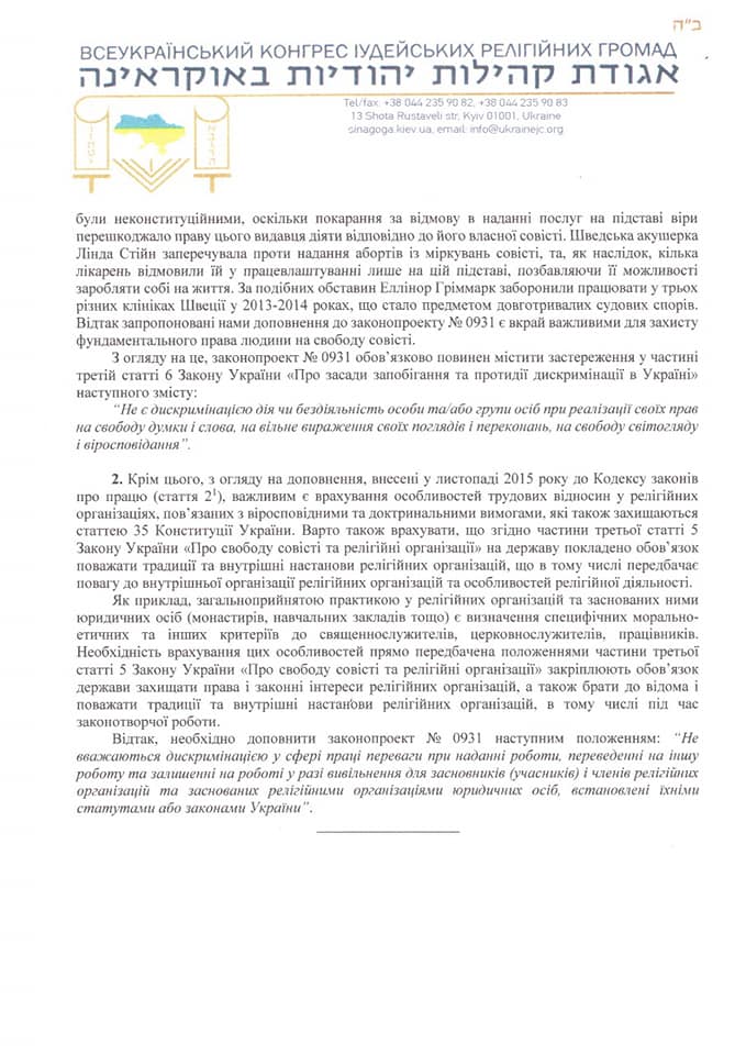 Еврейский лидер предложил дополнить законопроект № 0931 следующим положением: "Не считаются дискриминацией в сфере труда преимущества при предоставлении работы, переводе на другую работу и оставлении на работе в случае высвобождения для учредителей (участников) и членов религиозных организаций и основанных религиозными организациями юридических лиц, установленные их уставами или законами Украины".