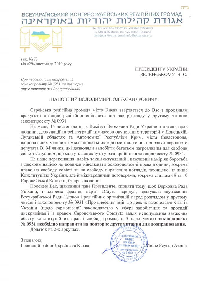 Главный раввин Украины и Киева Моше Реувен Асман обратился к президенту Украины Владимиру Зеленскому и парламенту с просьбой доработать проект закона №0931, чтобы не допустить ограничения конституционных прав граждан. Копию обращения религиозный деятель опубликовал в своем Facebook.
