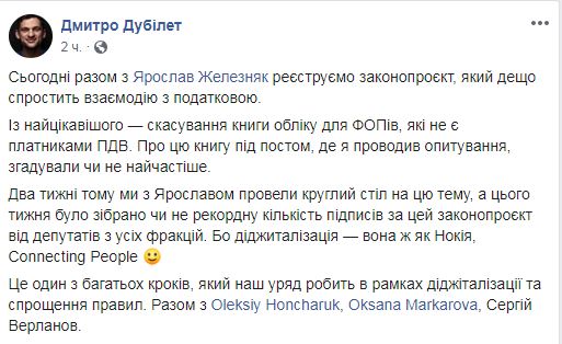 "Сегодня вместе с Ярославом Железняком (первый заместитель главы Комитета ВР по вопросам финансов, налоговой и таможенной политики - Ред.) регистрируем законопроект, который несколько упростит взаимодействие с налоговой. Из самого интересного - отмена книги учета для ФОП, которые не являются плательщиками НДС. Об этой книге под постом, где я проводил опрос, вспоминали чаще всего", - сообщил он.