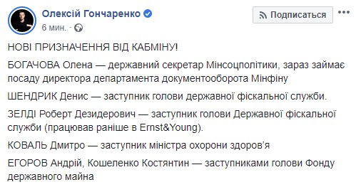 В среду, 4 декабря, Кабинет министров Украины осуществил новые назначения на должности госсекретаря Минсоцполитики и заместителей нескольких ведомств. Об этом сообщил народный депутат Алексей Гончаренко на своей странице в Facebook.