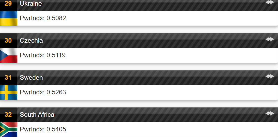 В ежегодном рейтинге военной мощи Global Firepower 2019 Military Strength Ranking украинская армия занимает 29-ю позицию, опережая по силе армию Южной Африки, Швеции и Чехии. На первом месте - армия США, на втором месте - РФ, на третьем - Китай.