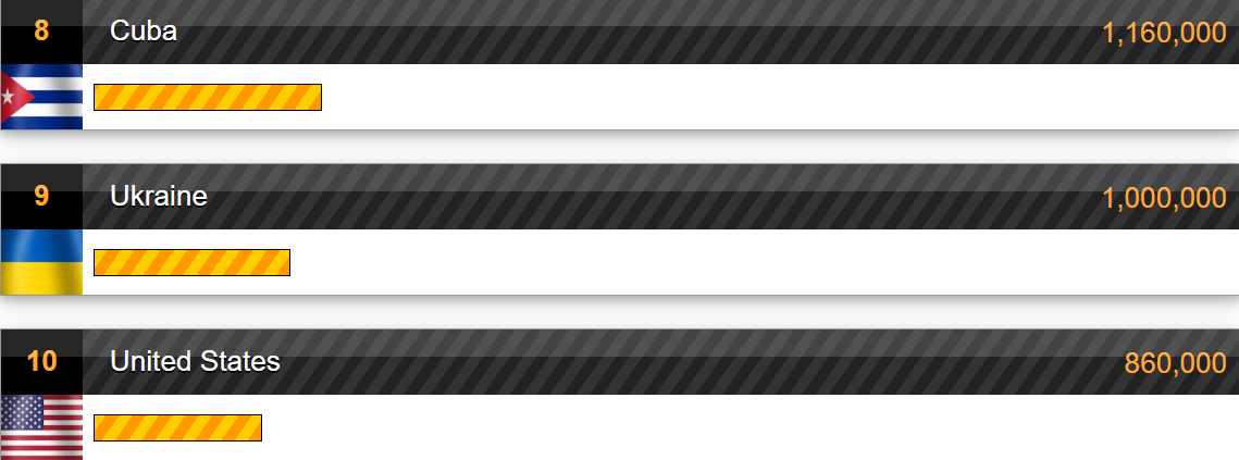 Число резервистов в украинской армии - около миллиона человек. Это 9 позиция рейтинга. В то время, как армия США занимает 10 строку рейтинга с количеством резервистов - около 860 тысяч человек.