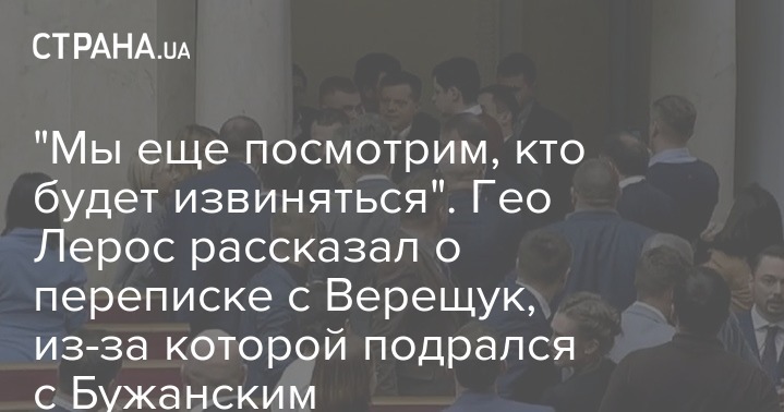 Нардеп Гео Лерос в комментарии журналистам "Страны" продолжает настаивать на том, что не стоит раскрывать секреты внутренней кухни "Слуги народа" после того, как в закрытом чате он якобы оскорбил коллегу по партии Ирину Верещук. Коллеги по фракции никак не отреагировали на инцидент, за женщину вступился только Макс Бужанский, который полез драться с Леросом во время заседания Верховной Рады.