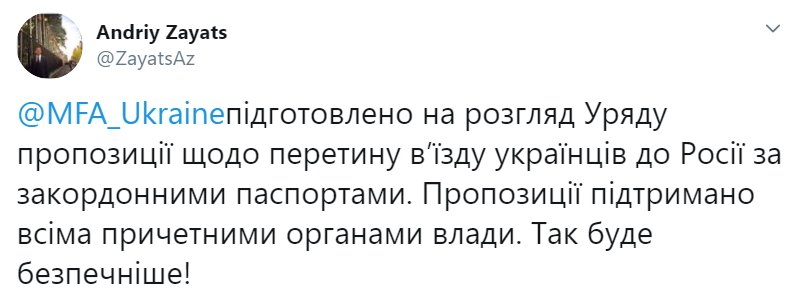"МИД Украины подготовил на рассмотрение правительства предложения о пресечении въезда украинцев в Россию по заграничным паспортам. Предложение поддержано всеми причастными органами власти. Так будет безопаснее!" - говорится в опубликованном сообщении.