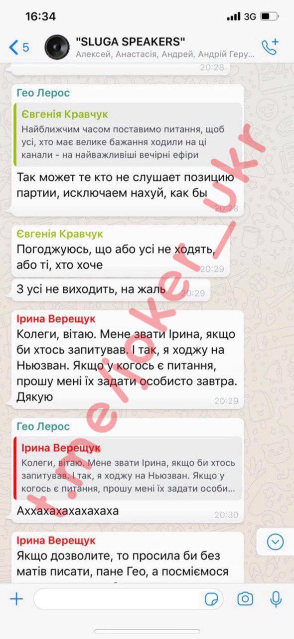 Как выяснилось, причиной послужила переписка в чате "Слуги народа", где Лерос позволил себе матерные выражения в адрес Верещук. Та попросила извинений, но нардеп дал понять, что их не будет. В сеть попали скрины тех самых сообщений, вызвавших бурю в зале.