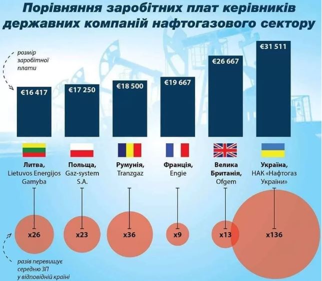 К примеру, руководитель компании Ofgem (Великобритания) в 2017 году получал 26 667 евро в месяц (в 13 раз больше средней зарплаты по стране), руководитель Engie (Франция) – 19 667 евро (в 9 раз больше), Tranzgaz (Румыния) – 18500 евро (в 36 раз больше), Gaz-system (Польша) – 17250 евро (в 23 раза больше), Lietuvos Energijos Gamyba – 16 417 евро (в 26 раз больше).