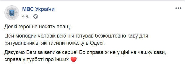 "Некоторые герои не носят плащи. Этот молодой человек всю ночь готовил бесплатно кофе для спасателей, которые тушили пожар в Одессе. Благодарим вас за большое сердце! Потому что дело ведь не в цене на чашку кофе, дело в заботе о других", - сказано в сообщении на странице ведомства.