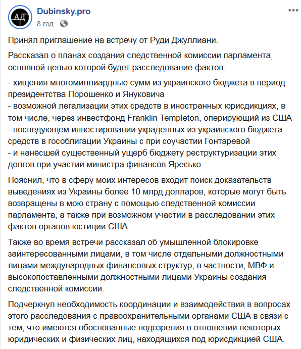 "Принял приглашение на встречу от Руди Джулиани. Рассказал о планах создания следственной комиссии парламента, основной целью которой будет расследование фактов: