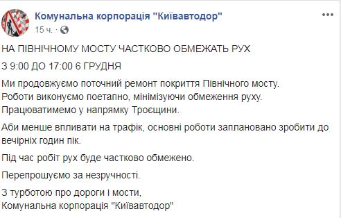 Ограничение будет действовать с 9:00 до 17:00 6 декабря. "Мы продолжаем текущий ремонт покрытия Северного моста. Работы выполняем поэтапно, минимизируя ограничения движения. Работать будем в направлении Троещины", - уточнили коммунальщики.