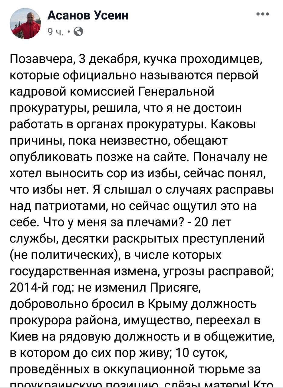 Вот, что пишет на своей странице в Facebook "зарубленный" экзаменаторами прокурор Усеин Асанов: "Позавчера, 3 декабря, кучка проходимцев, которые официально называются первой кадровой комиссией Генеральной прокуратуры, решила, что я не достоин работать в органах прокуратуры. Каковы причины, пока неизвестно, обещают опубликовать позже на сайте. Поначалу не хотел выносить сор из избы, сейчас понял, что избы нет. Я слышал о случаях расправы над патриотами, но сейчас ощутил это на себе.