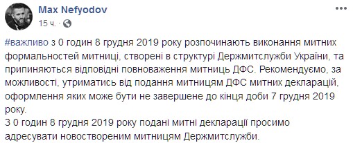 Глава Государственной таможенной службы Украины Максим Нефедов предупредил украинцев о возможных проблемах при запуске новой службы с 8 декабря. Об этом он сообщил в Facebook.