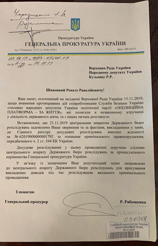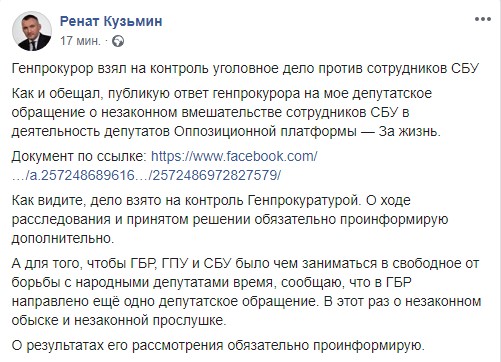 "Генпрокурор взял на контроль уголовное дело против сотрудников СБУ. Как и обещал, публикую ответ генпрокурора на мое депутатское обращение о незаконном вмешательстве сотрудников СБУ в деятельность депутатов "Оппозиционной платформы - За жизнь". Как видите, дело взято на контроль Генпрокуратурой. О ходе расследования и принятом решении обязательно проинформирую дополнительно", - написал он.