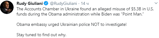 Как утверждает Джулиани, в Украине ненадлежащим образом использовали выделенные в качестве помощи США 5,3 млрд долларов. Причем большая их часть была израсходована на неправительственные организации посольства США, которое в свою очередь надавило на украинскую полицию, чтобы силовики не проводили расследование.