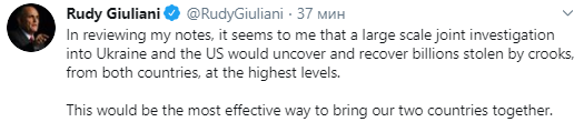 "Изучая мои записи, мне кажется, что широкомасштабное совместное расследование в отношении Украины и США позволило бы обнаружить и вернуть миллиарды, украденные мошенниками из обеих стран на самых высоких уровнях. Это был бы самый эффективный способ объединить наши две страны" - подытожил адвокат президента США.