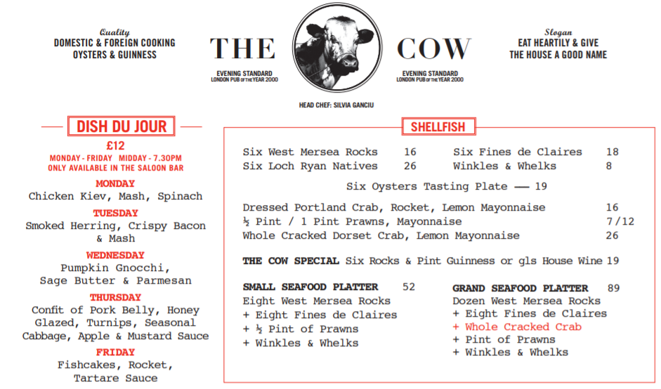 Внешний вид паба и предлагаемые в нем блюда. Фото: thecowlondon.co.uk