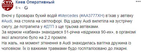 Сегодня ночью, 8 декабря, в Броварах пьяный водитель, находившийся за рулем автомобиля Mercedes, врезался на большой скорости в машину Audi, которая стояла на перекрестке. В результате Audi вылетела на встречную полосу, где попала в ДТП с еще тремя легковушками. Об этом сообщается на странице "Киев Оперативный" в Facebook.