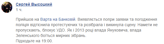 "Пришел на "Стражу на Банковой". Оказывается несмотря на заявки и согласования полиция оттеснила протестующих и разобрала и выбросила сцену. Палатки не пропускают, блокирует УГО. Как и в 2013 году власть Януковича, власть Зеленского боится мирных собраний. Подходите на 19:00", - призвал Высоцкий.