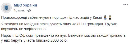 "В мероприятиях на Майдане приняли участие около 8000 граждан. Грубых нарушений не зафиксировано", - говорится в сообщении. В полиции отмечают, что сейчас под офисом президента на ул. Банковой массовые мероприятия продолжаются, в них принимают участие около 2000 человек.