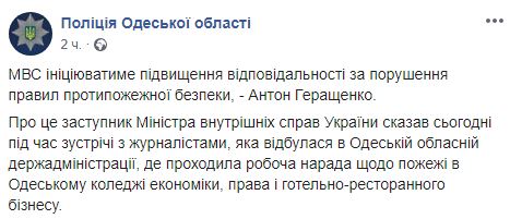 "На сегодня ответственность для руководителя учреждения, в котором выявлены нарушения, - всего 170 гривен штрафа. Поэтому руководители просто игнорируют нормы противопожарной безопасности, что в конечном итоге и приводит к таким трагедиям, как в Одессе", - отметил Антон Геращенко.