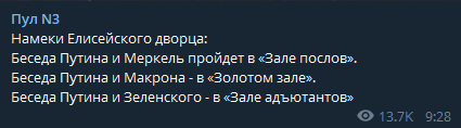 В то же время, по данным канала, Путин должен встретится с канцлером Германии Ангелой Меркель в "Зале послов", а с президентом Франции в "Золотом зале".