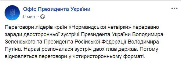 "Переговоры лидеров стран Нормандской четверки прерваны ради двусторонней встречи президента Украины Владимира Зеленского и президента Российской Федерации Владимира Путина. Сейчас началась встреча двух глав государств. После возобновятся переговоры в четырехстороннем формате", - сказано в Facebook ОП.