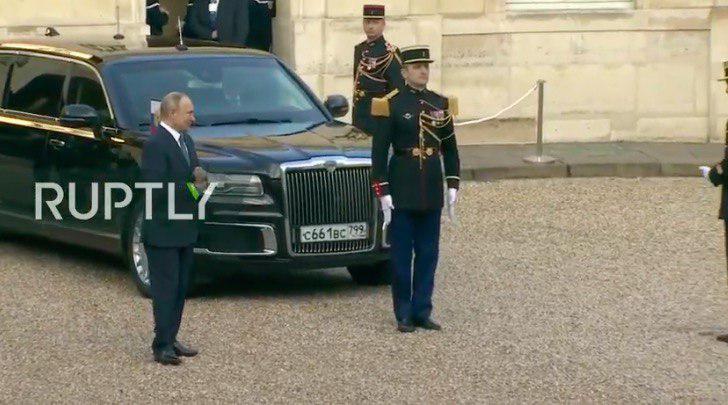 Президент России Владимир Путин приехал в Елисейский дворец в Париже на нормандскую встречу на российском лимузине Aurus, который, вероятно, был привезен прямиком из Москвы.
