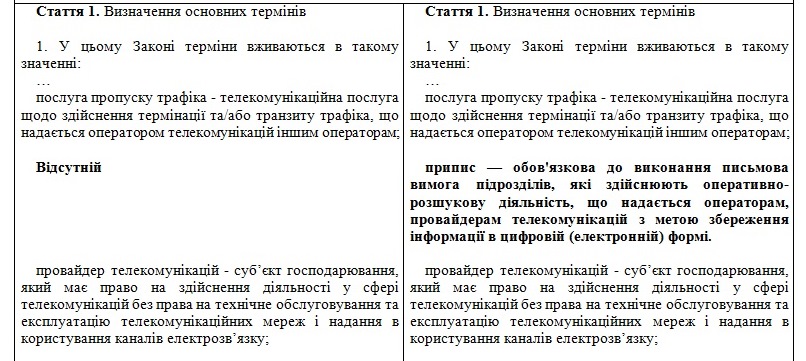 Как сообщается, представитель Национальной полиции Украины в рабочей группе предлагал в основные термины законопроекта ввести понятие "предписание" как "обязательное к исполнению письменное требование подразделений, осуществляющих оперативно-розыскную деятельность, которое предоставляется операторам, провайдерам телекоммуникаций с целью сохранения информации в цифровой (электронной) форме".