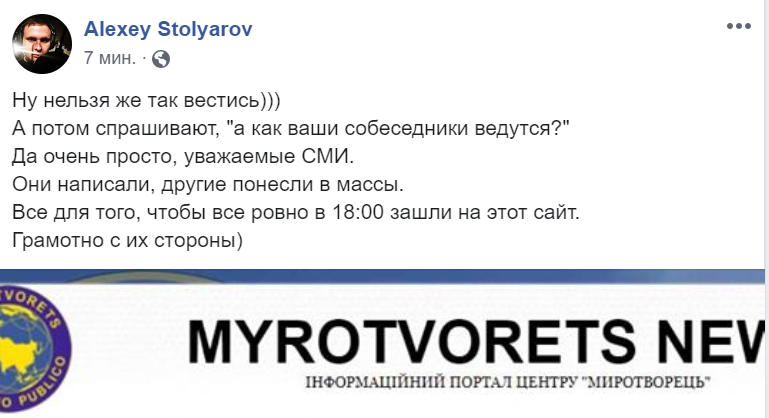 "Ну нельзя же так вестись. А потом спрашивают, "а как ваши собеседники ведутся?". Да очень просто, уважаемые СМИ. Они написали, другие понесли в массы. Все для того, чтобы все ровно в 18:00 зашли на этот сайт.