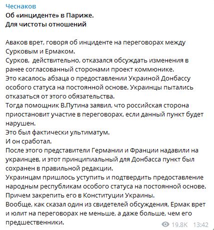 "Аваков врет, говоря об инциденте на переговорах между Сурковым и Ермаком. Сурков, действительно, отказался обсуждать изменения в ранее согласованный сторонами проект коммюнике. Это касалось абзаца о предоставлении Украиной Донбассу особого статуса на постоянной основе. Украинцы пытались отказаться от этого обязательства. Тогда помощник Путина заявил, что российская сторона приостановит участие в переговорах, если данный пункт будет нарушен", - заявил Чеснаков.