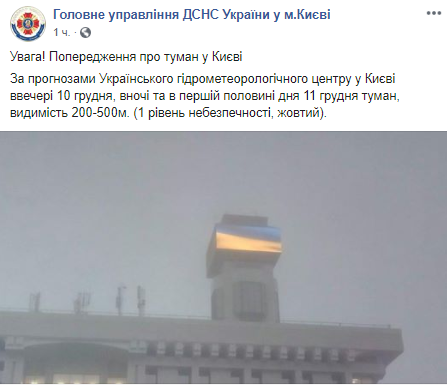 "Внимание! Предупреждение о тумане в Киеве. По прогнозам Украинского гидрометеорологического центра в Киеве вечером 10 декабря, ночью и в первой половине дня 11 декабря туман, видимость 200-500 м. (1 уровень опасности, желтый)", - говорится в сообщении.