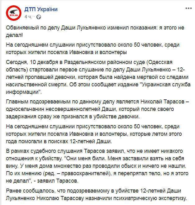 Обвиняемый по делу 11-летней Даши Лукьяненко из поселка Ивановка, которую в июне нашли убитой в выгребной яме частного дома в Одесской области, изменил свои показания. Об этом сообщается на Facebook-странице "ДТП Украины".
