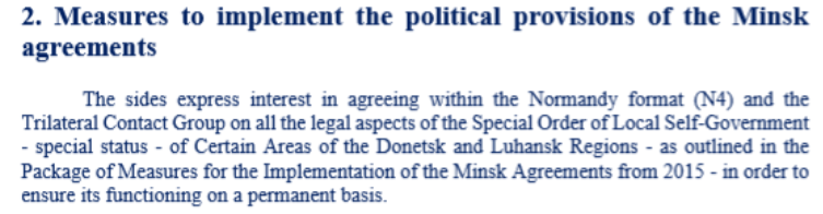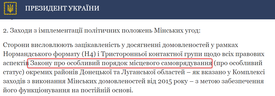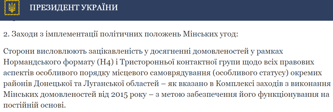 В президентской версии заявлялось, что стороны согласовали продолжение работы над законом об особом статусе Донбасса. Хотя в оригинале закон вообще не упоминался, а речь шла о "правовых аспектах" особого статуса в целом.