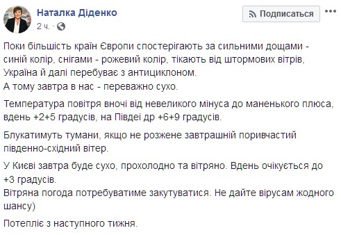"В Киеве завтра будет сухо, прохладно и ветрено. Днем ожидается до +3 градусов. Ветреная погода нуждаться закутываться. Не дайте вирусам ни единого шанса. Потеплеет со следующей недели", - подчеркнула она.