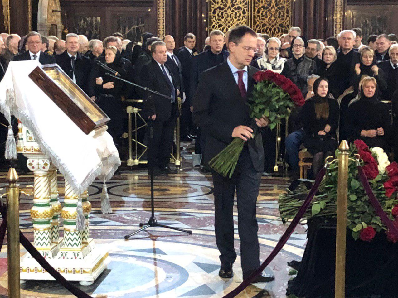 11:40 После отпевания траурная церемония продолжилась. С огромным букетом приехал глава Внешэкономбанка, бывший первый зампред правительства Игорь Шувалов. Попрощаться с покойным прибыл известный певец Валерий Меладзе.