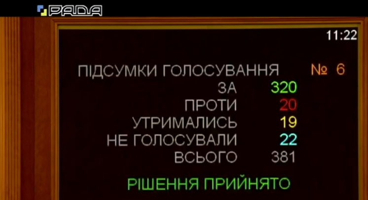 За - 320, против - 20, воздержались - 19, не голосовали - 22.