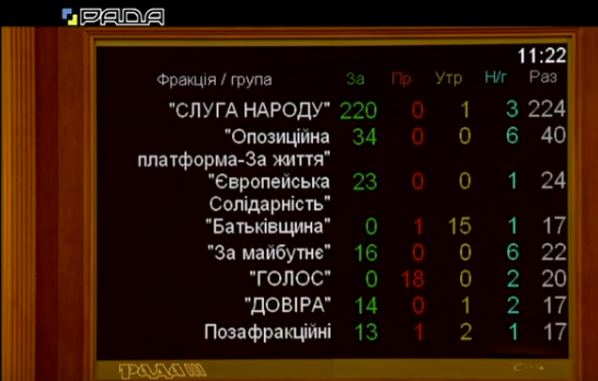 От Слуги народа - 220 голосов, Оппозиционная платформа "За жизнь" - 34, Европейская солидарность - 23, внефракционные - 13, За майбутнє - 16, Довiра - 14, Голос - 0, Батькивщина - 0.