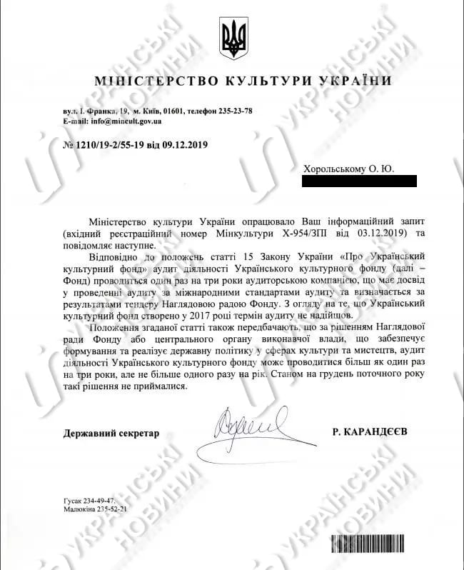 "Учитывая то, что Украинский культурный фонд создан в 2017 году, время аудита не пришло", - говорится в ответе.