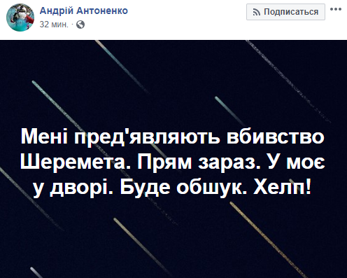 "Мне предъявляют убийство Шеремета. Прямо сейчас. В моем дворе. Будет обыск. Хелп! (Помогите! - Ред.)", - написал Антоненко.
