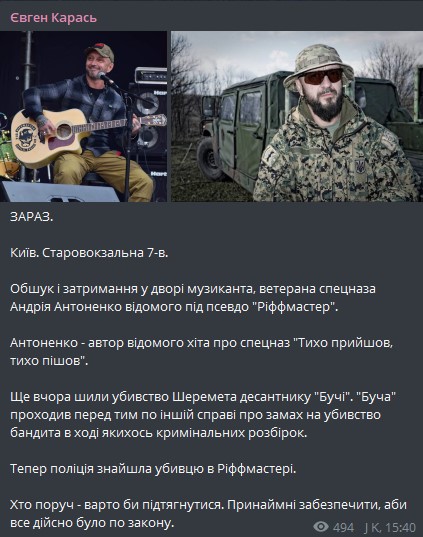 "Сейчас. Киев. Старовокзальная 7-в. Обыск и задержание во дворе музыканта, ветерана спецназа Андрея Антоненко известного под псевдонимом "Риффмастер". Антоненко - автор известного хита про спецназ "Тихо пришел, тихо ушел".