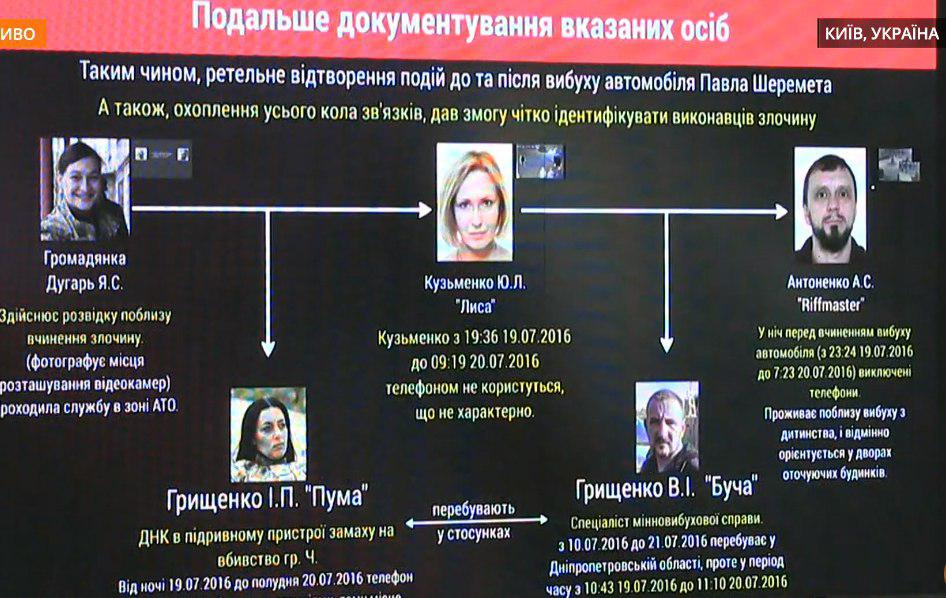 Первая - Яна Дугарь, служившая в АТО. По данным расследования, экспертные исследования подтверждают, что именно она попала в объектив камер за несколько дней до дня убийства - 20 июля 2016 года. Проводила разведку рядом с местом проведения преступления: фотографировала места сосредоточения видеокамер.