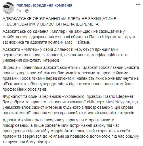 Основанное юристом Маси Найемом адвокатское объединение "Миллер" не будет защищать подозреваемых по делу об убийстве журналиста Павла Шеремета, потому что погибший был другом Найема. Об этом говорится в заявлении компании на странице в Facebook.