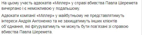 "Адвокаты "Миллер" не входили в дело на стороне защиты подозреваемых, а только обеспечили соблюдение закона при проведении следственных действий у Андрея Антоненко, который воспользовался своим правом и обратился в компанию за правовой помощью во время обыска и вручения ему подозрения. На этом участие адвокатов "Миллер" в деле убийства Павла Шеремета исчерпано и невозможно в дальнейшем. Адвокаты компании в будущем не будут представлять интересы Андрея Антоненко и не будут защищать других клиентов объединения, которые будут фигурировать или могут быть связаны с делом убийства Павла Шеремета", - говорится в заявлении