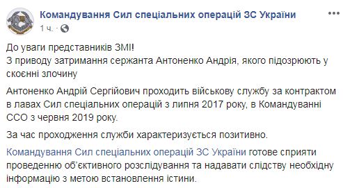 "По поводу задержания сержанта Антоненко Андрея, которого подозревают в совершении преступления. Антоненко Андрей Сергеевич проходит военную службу по контракту в рядах Сил специальных операций с июля 2017 года, в Командовании ССО с июня 2019 года. За время прохождения службы характеризуется положительно", - отмечается в сообщении.